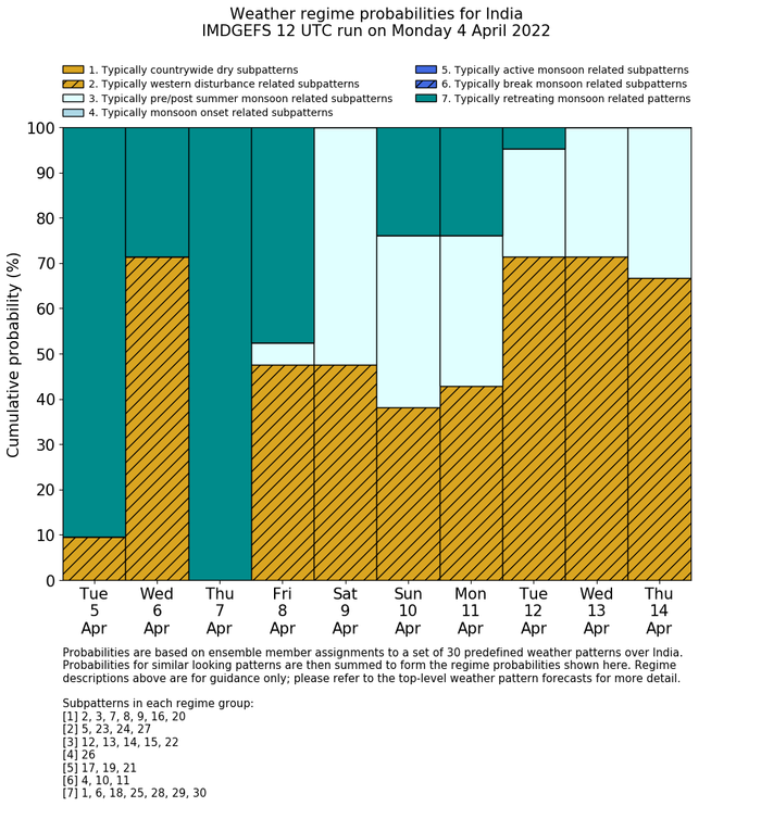 | Weather patterns typically associated with pre-monsoon tendencies over India are most likely Weather patterns 12, 13, 14, 15 and 22 (pre-monsoon) | |