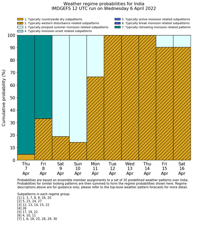 | Weather patterns typically associated with pre-monsoon tendencies over India are most likely Weather patterns 12, 13, 14, 15 and 22 (pre-monsoon) | |