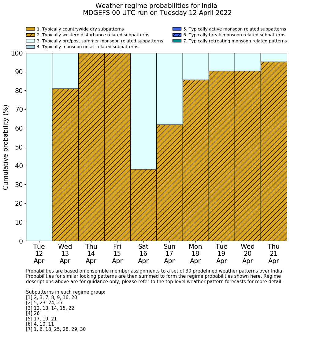 | Weather patterns typically associated with pre-monsoon tendencies over India are most likely Weather patterns 12, 13, 14, 15 and 22 (pre-monsoon) | |