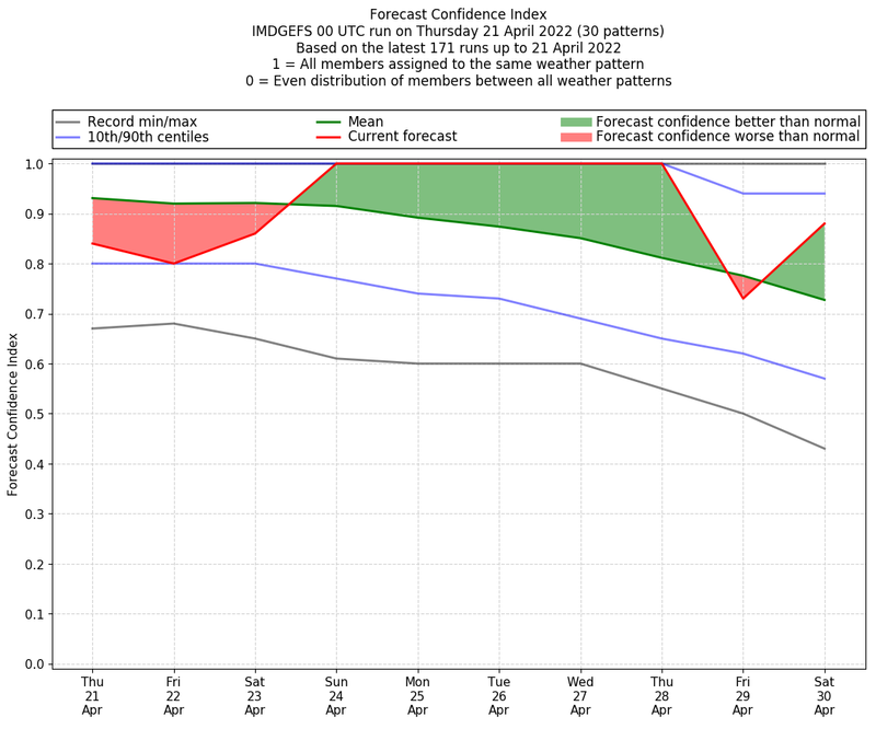 | Weather patterns typically associated with contrywide dry period tendencies over India are most likely Weather patterns 2, 3, 7, 8, 9, 16 and 20 (countrywide winter dry period) | |