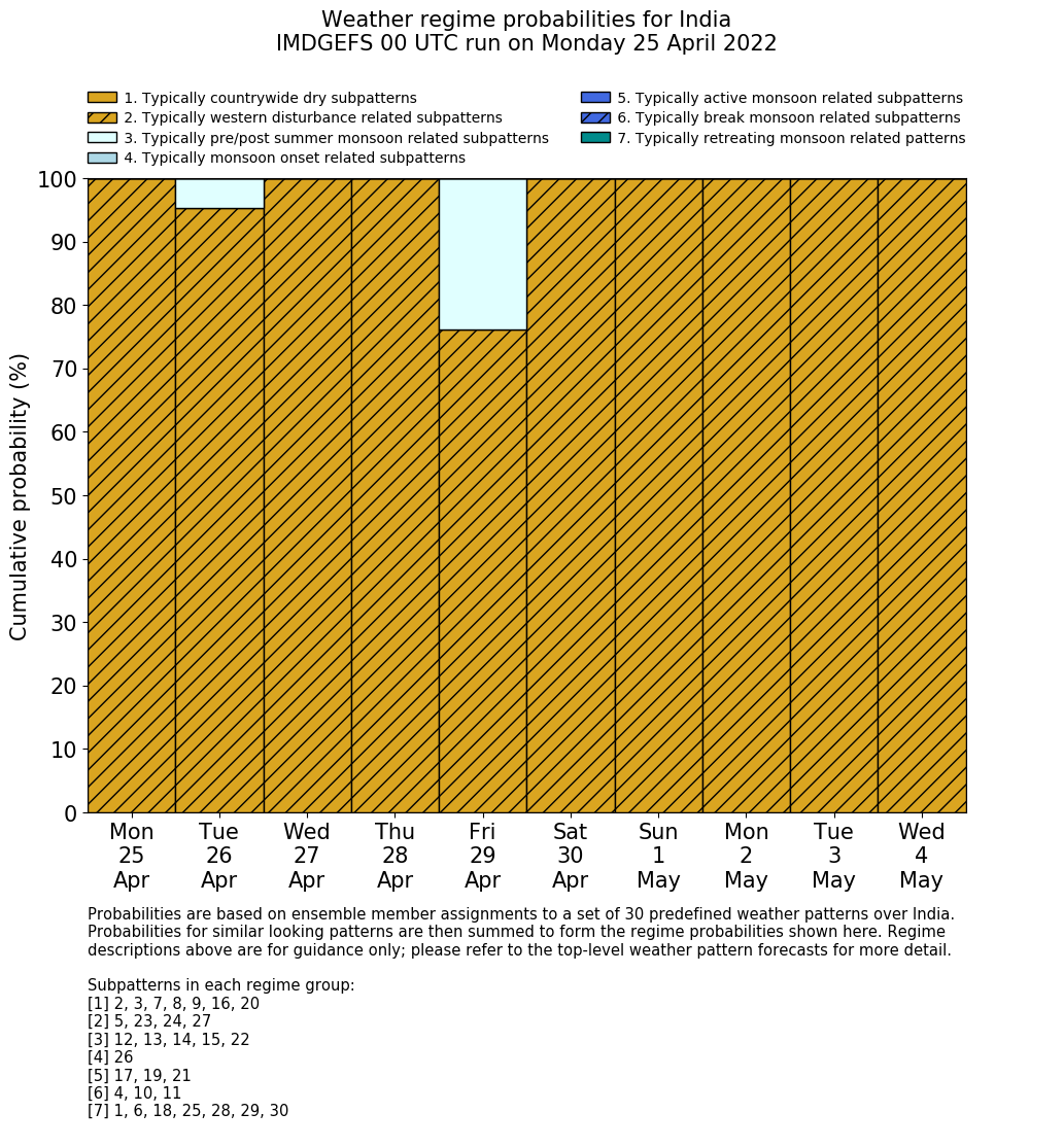 | Weather patterns typically associated with contrywide dry period tendencies over India are most likely Weather patterns 2, 3, 7, 8, 9, 16 and 20 (countrywide winter dry period) | |
