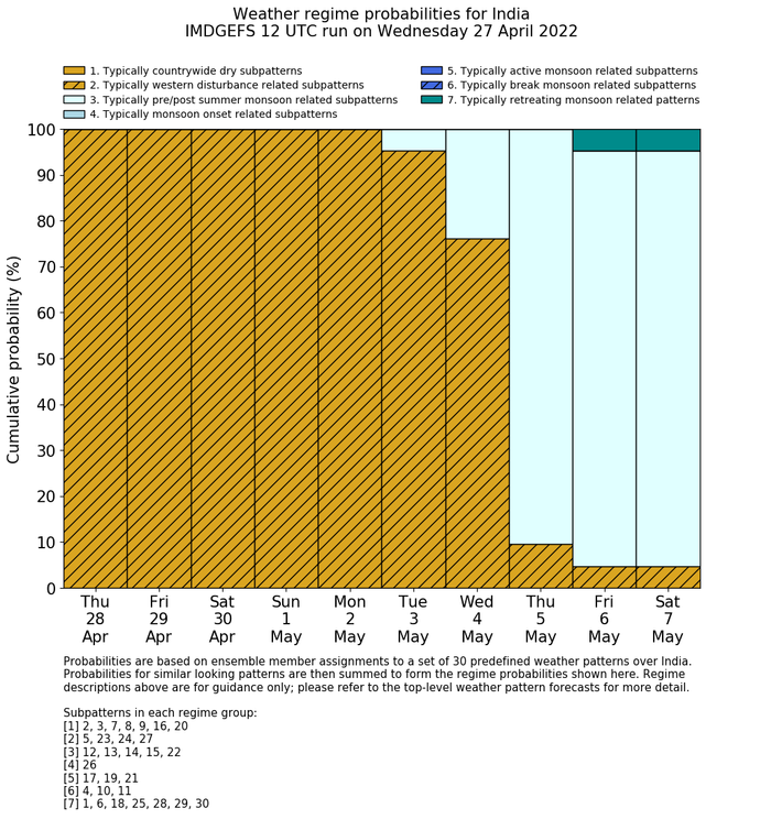 | Weather patterns typically associated with pre-monsoon tendencies over India are most likely Weather patterns 12, 13, 14, 15 and 22 (pre-monsoon) | |