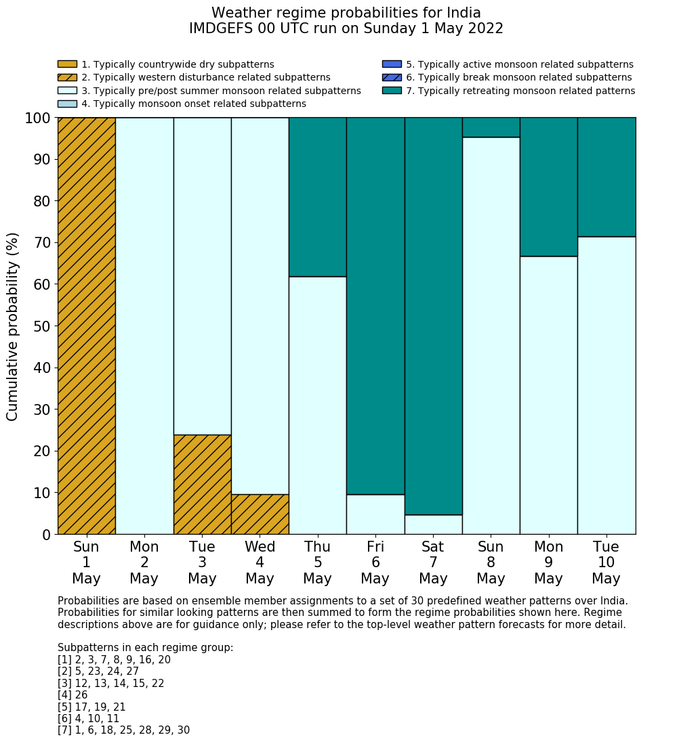 | Weather patterns typically associated with pre-monsoon tendencies over India are most likely Weather patterns 12, 13, 14, 15 and 22 (pre-monsoon) | |