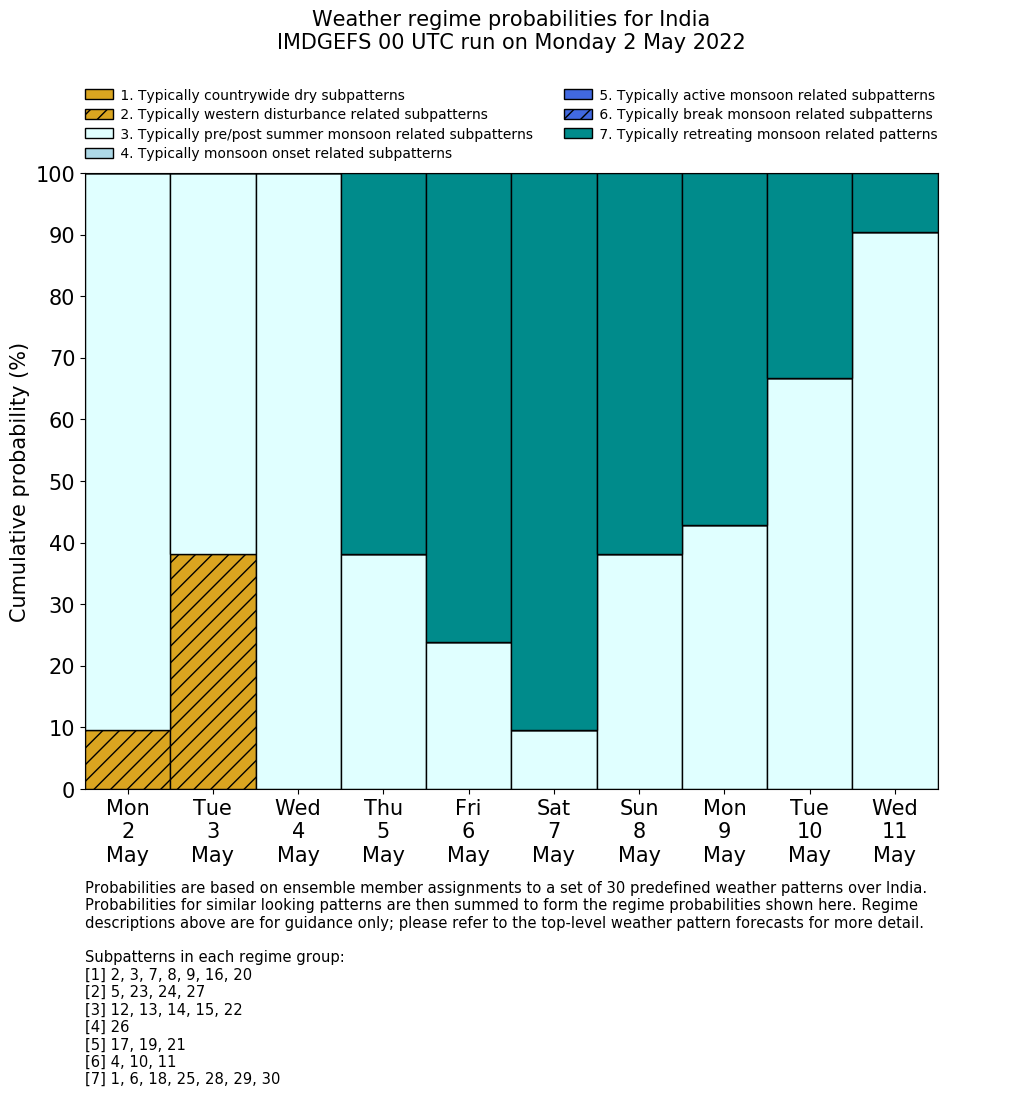 | Weather patterns typically associated with pre-monsoon tendencies over India are most likely Weather patterns 12, 13, 14, 15 and 22 (pre-monsoon) | |
