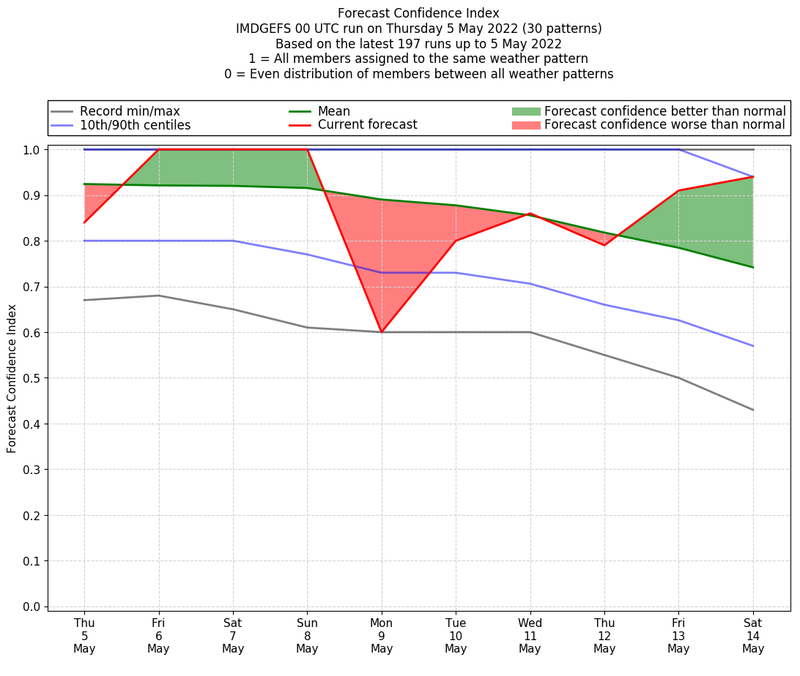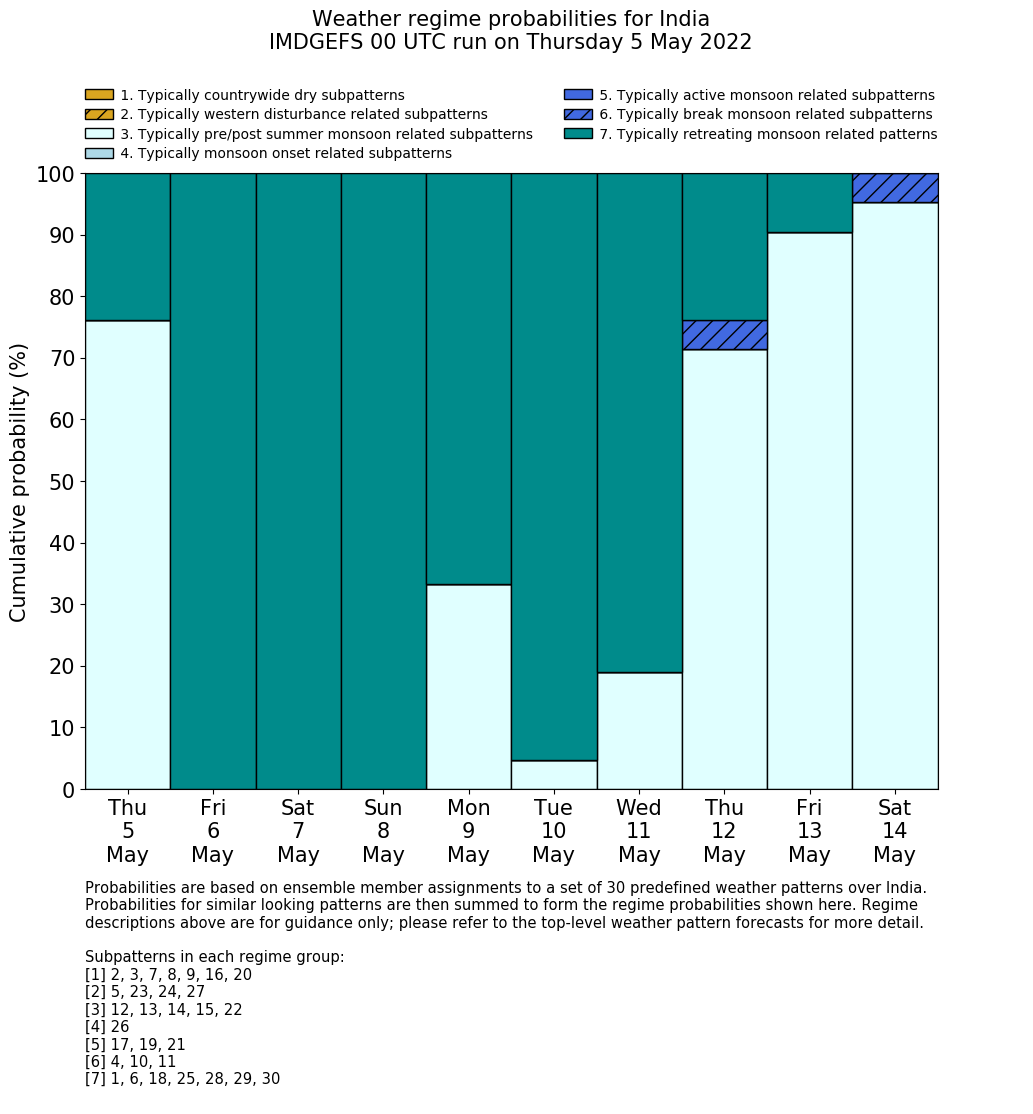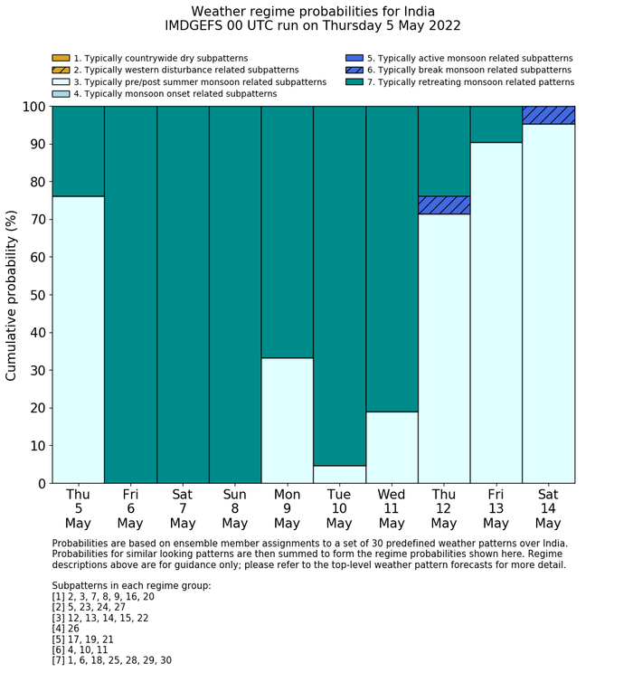 | Weather patterns typically associated with pre-monsoon tendencies over India are most likely Weather patterns 12, 13, 14, 15 and 22 (pre-monsoon) | |