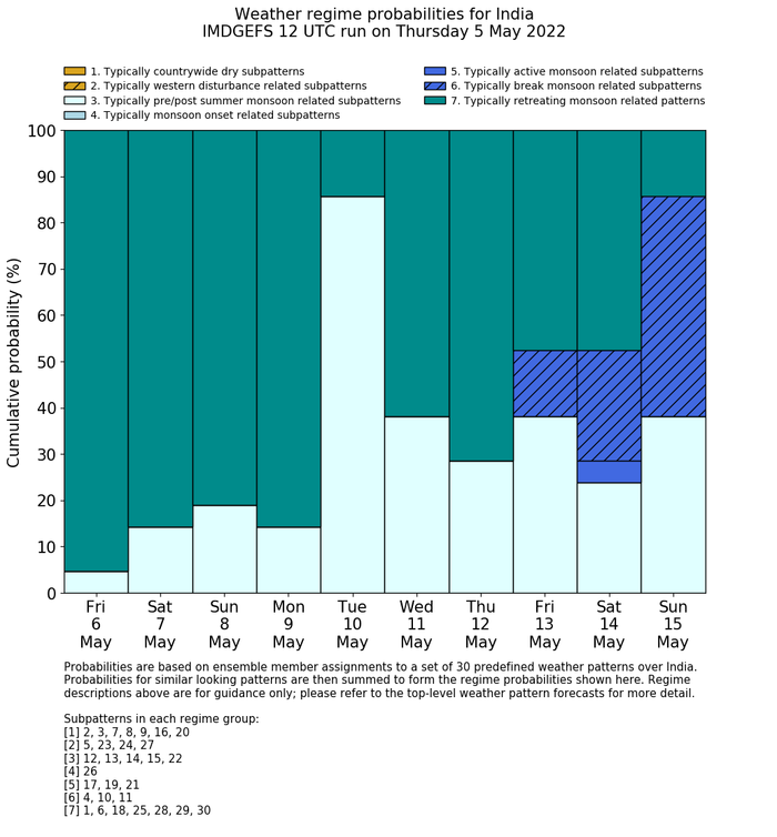| Weather patterns typically associated with pre-monsoon tendencies over India are most likely Weather patterns 12, 13, 14, 15 and 22 (pre-monsoon) | |