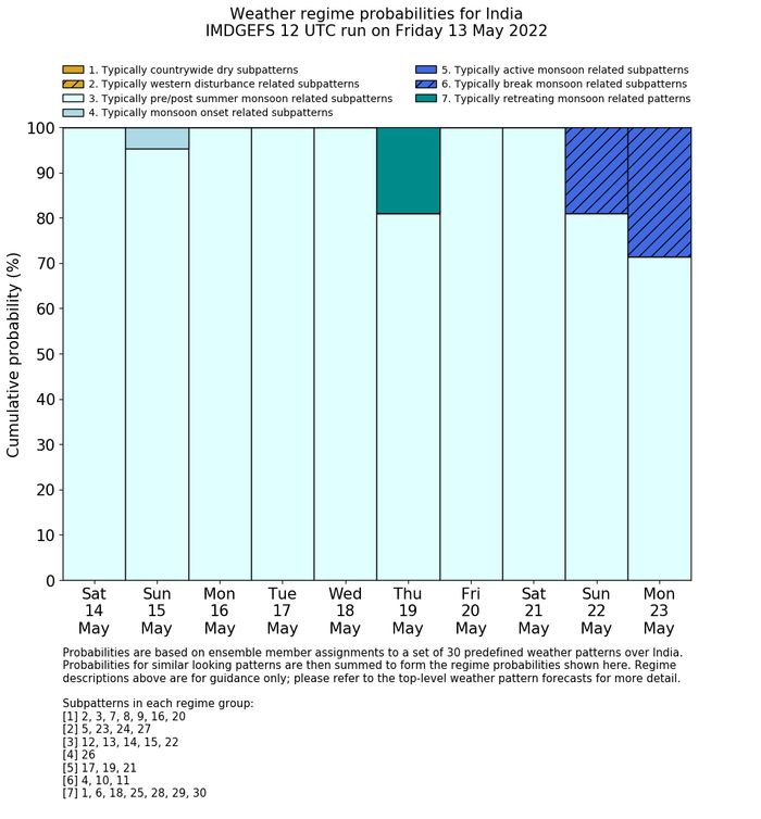 | Weather patterns typically associated with pre-monsoon tendencies over India are most likely Weather patterns 12, 13, 14, 15 and 22 (pre-monsoon) | |
