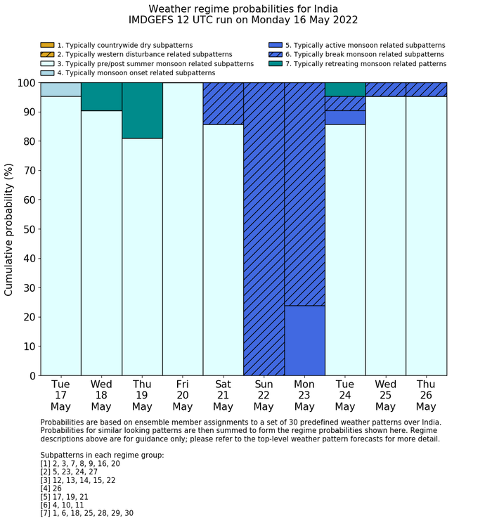 | Weather patterns typically associated with pre-monsoon tendencies over India are most likely Weather patterns 12, 13, 14, 15 and 22 (pre-monsoon) | |