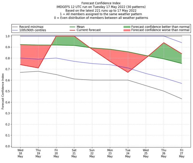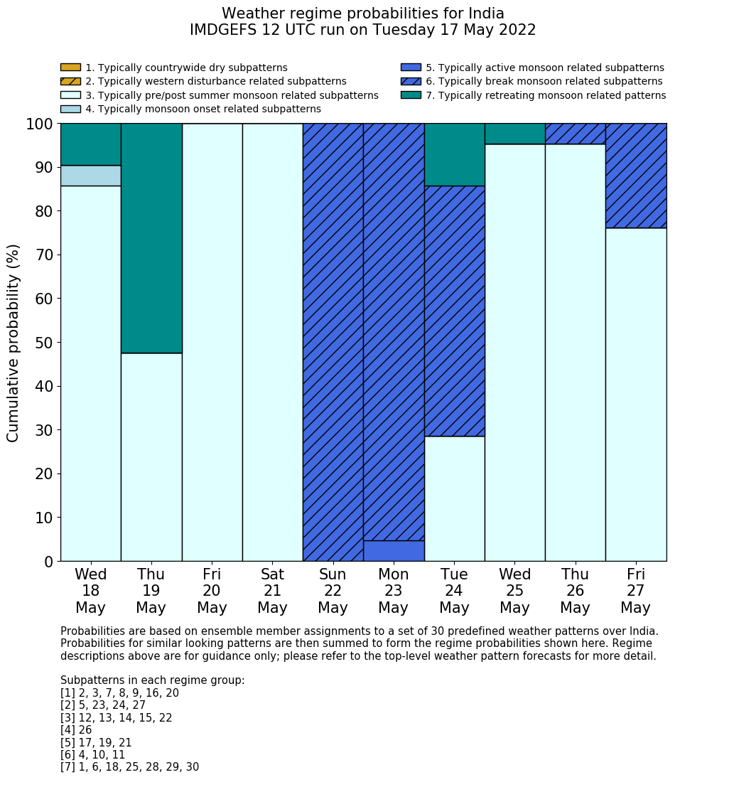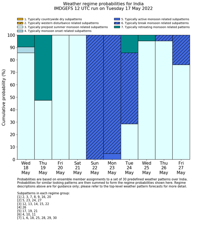 | Weather patterns typically associated with pre-monsoon tendencies over India are most likely Weather patterns 12, 13, 14, 15 and 22 (pre-monsoon) | |