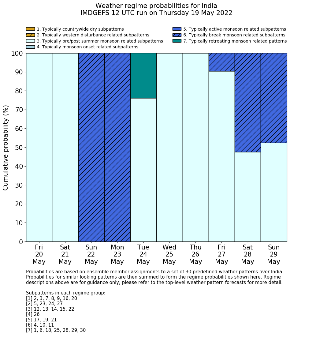| Weather patterns typically associated with pre-monsoon tendencies over India are most likely Weather patterns 12, 13, 14, 15 and 22 (pre-monsoon) | |