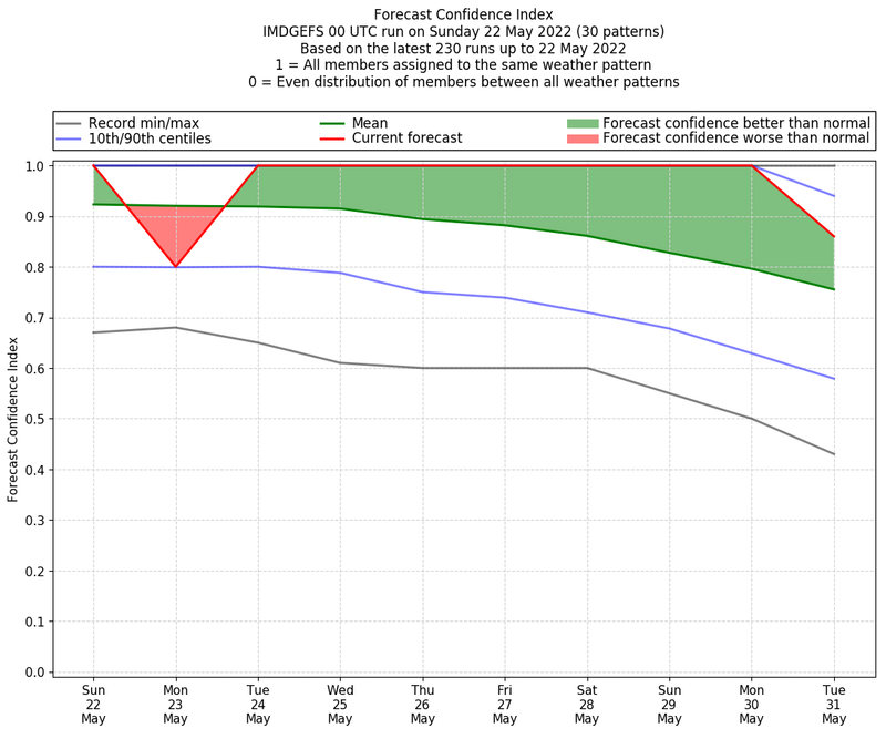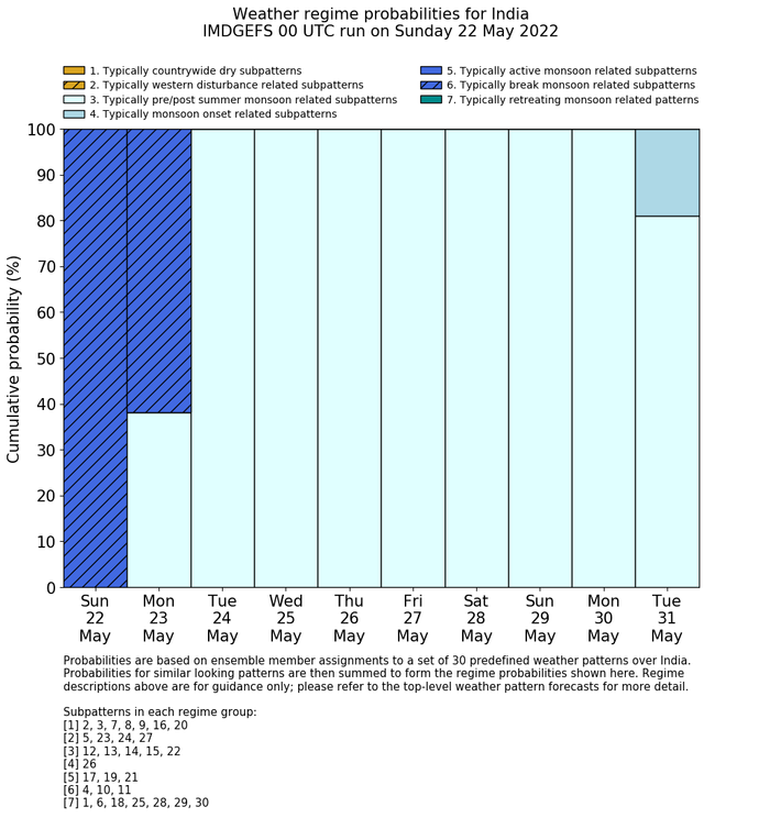 | Weather patterns typically associated with pre-monsoon tendencies over India are most likely Weather patterns 12, 13, 14, 15 and 22 (pre-monsoon) | |