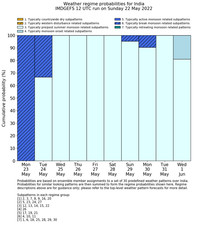 | Weather patterns typically associated with pre-monsoon tendencies over India are most likely Weather patterns 12, 13, 14, 15 and 22 (pre-monsoon) | |