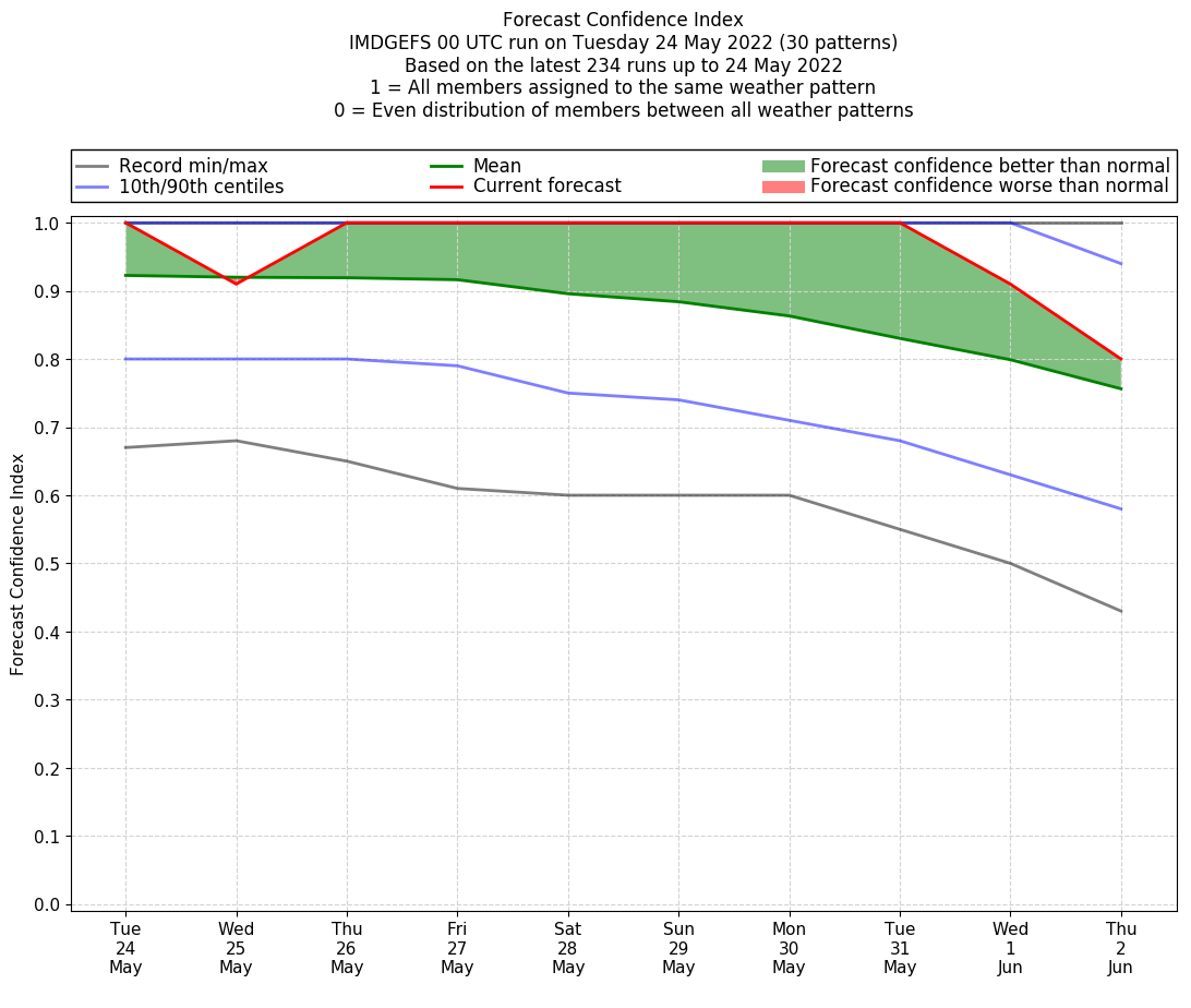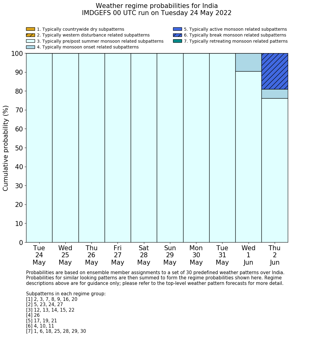 | Weather patterns typically associated with pre-monsoon tendencies over India are most likely Weather patterns 12, 13, 14, 15 and 22 (pre-monsoon) | |