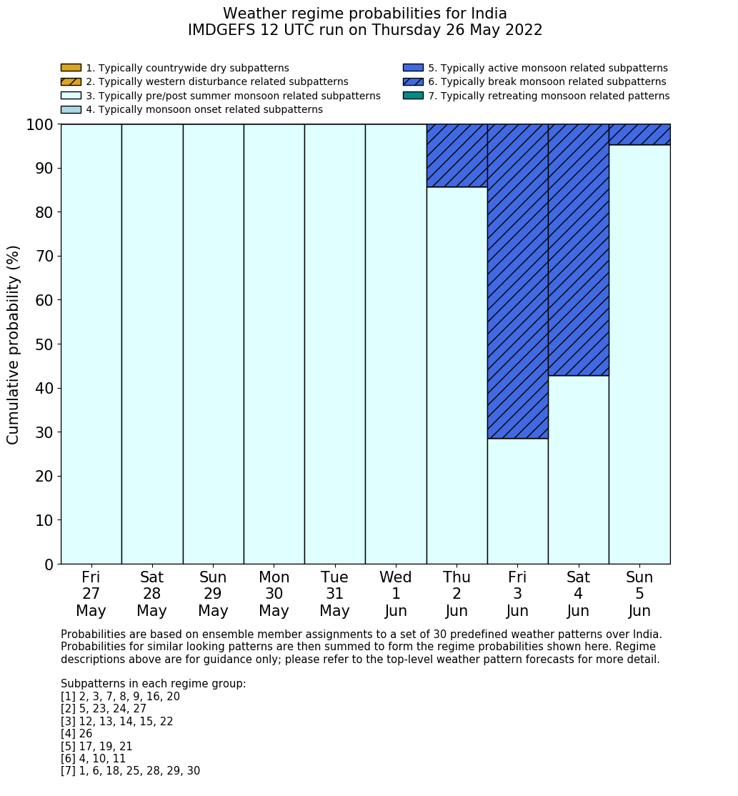| Weather patterns typically associated with summer monsoon tendencies over India are most likely Weather patterns 12, 13, 15, 15 and 22 (pre/post summer monsoon); 26 (onset); 17, 19 and 21 (active); 4, 10 and 11 (break) | |