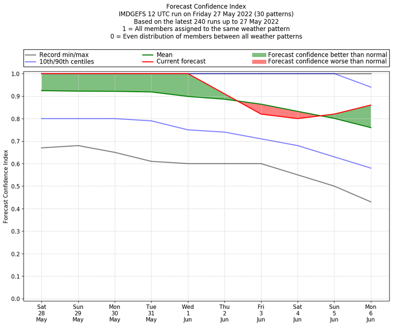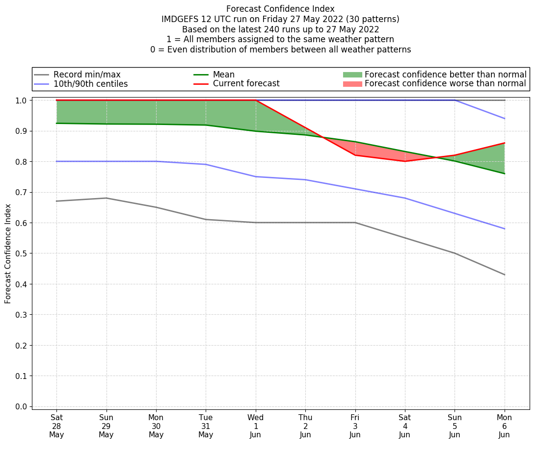 | Latest model run (27/12 UTC) | 100% | 100% | 100% | 100% | 100% | 90% | 71% | 62% | 90% | 100% |