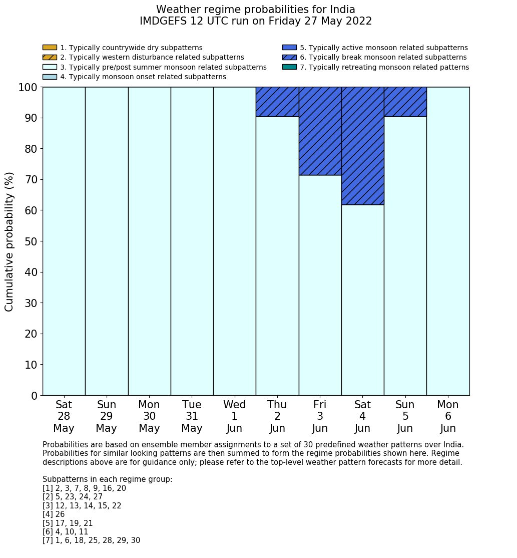 | Weather patterns typically associated with summer monsoon tendencies over India are most likely Weather patterns 12, 13, 15, 15 and 22 (pre/post summer monsoon); 26 (onset); 17, 19 and 21 (active); 4, 10 and 11 (break) | |