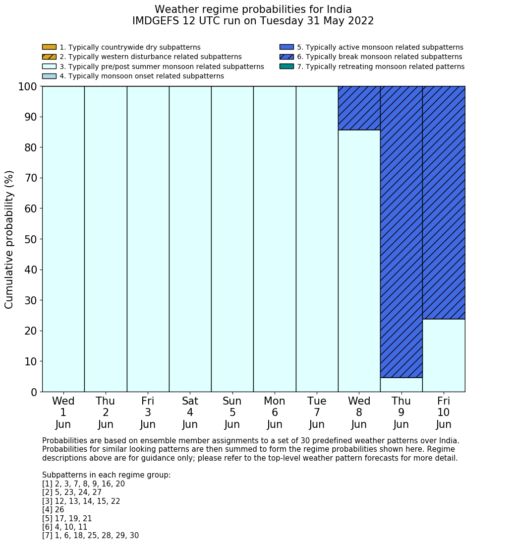 | Weather patterns typically associated with pre-monsoon tendencies over India are most likely Weather patterns 12, 13, 14, 15 and 22 (pre-monsoon) | |