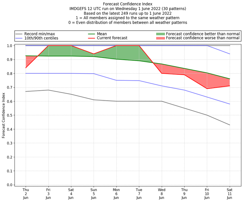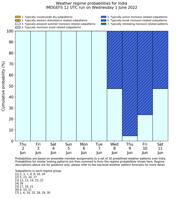 | Weather patterns typically associated with pre-monsoon tendencies over India are most likely Weather patterns 12, 13, 14, 15 and 22 (pre-monsoon) | |