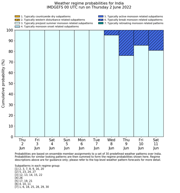 | Weather patterns typically associated with pre-monsoon tendencies over India are most likely Weather patterns 12, 13, 14, 15 and 22 (pre-monsoon) | |