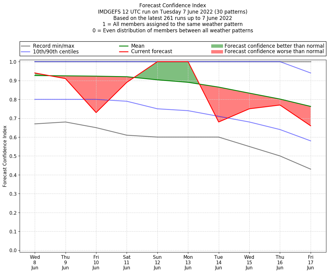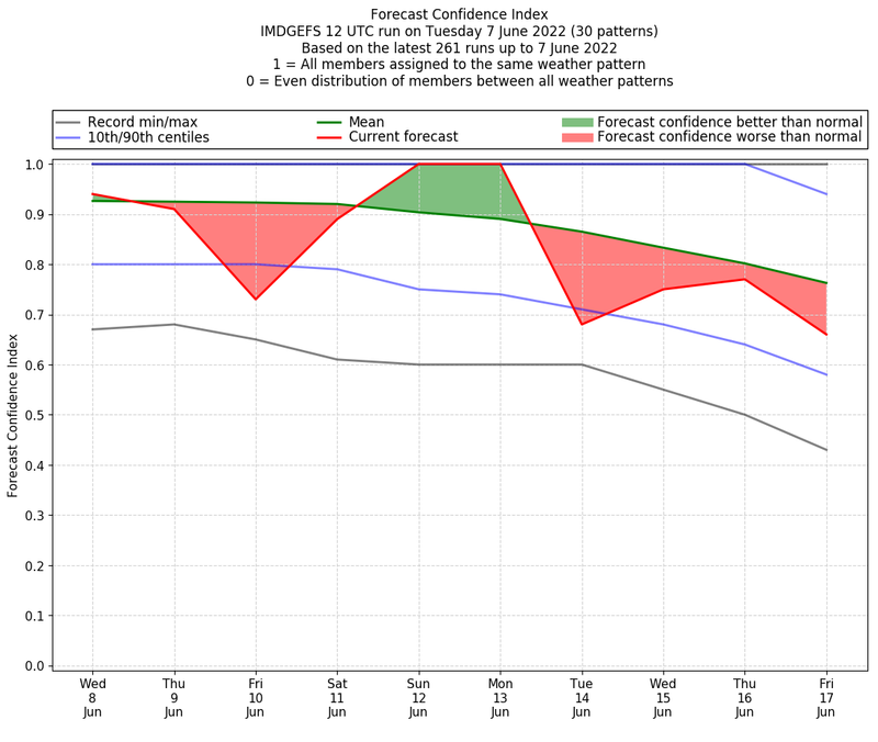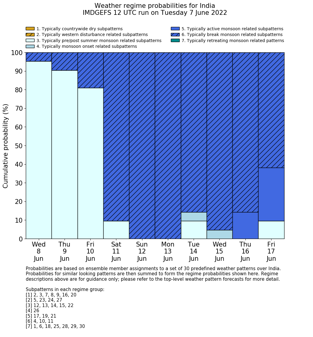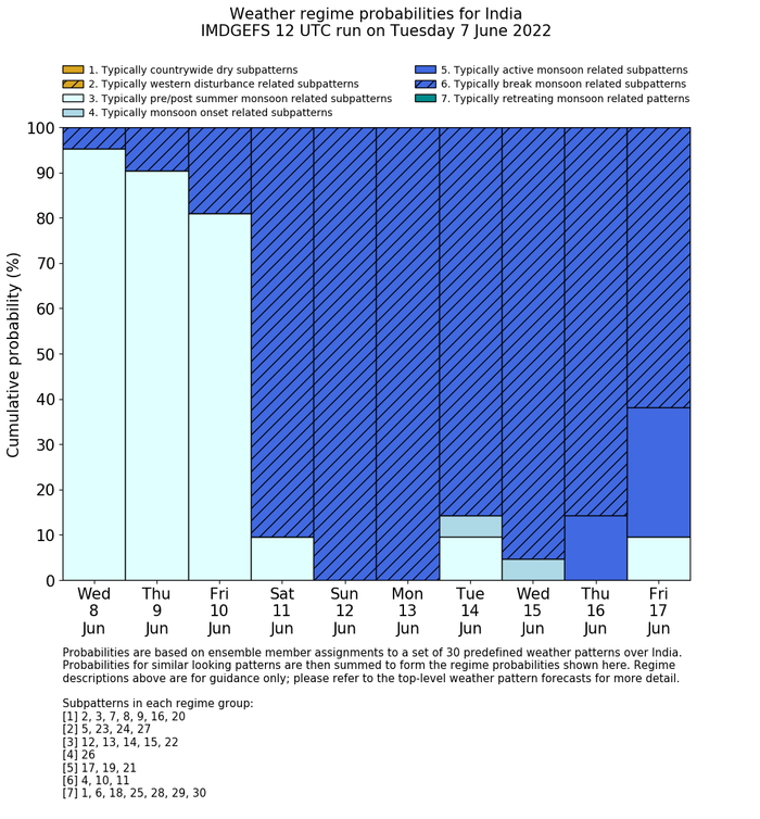| Weather patterns typically associated with pre-monsoon tendencies over India are most likely Weather patterns 12, 13, 14, 15 and 22 (pre-monsoon) | |