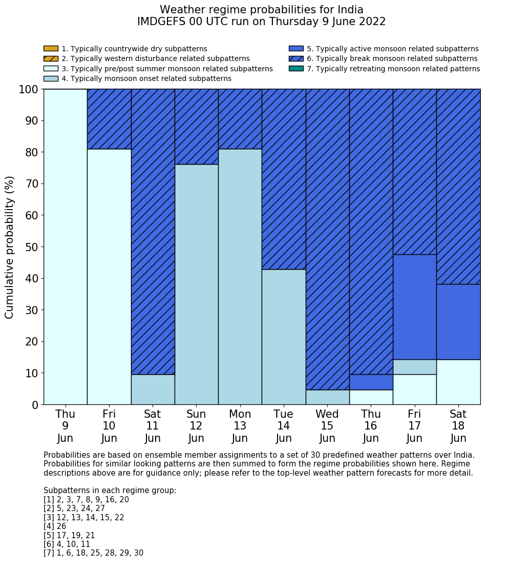| Weather patterns typically associated with summer monsoon tendencies over India are most likely Weather patterns 12, 13, 15, 15 and 22 (pre/post summer monsoon); 26 (onset); 17, 19 and 21 (active); 4, 10 and 11 (break) | |