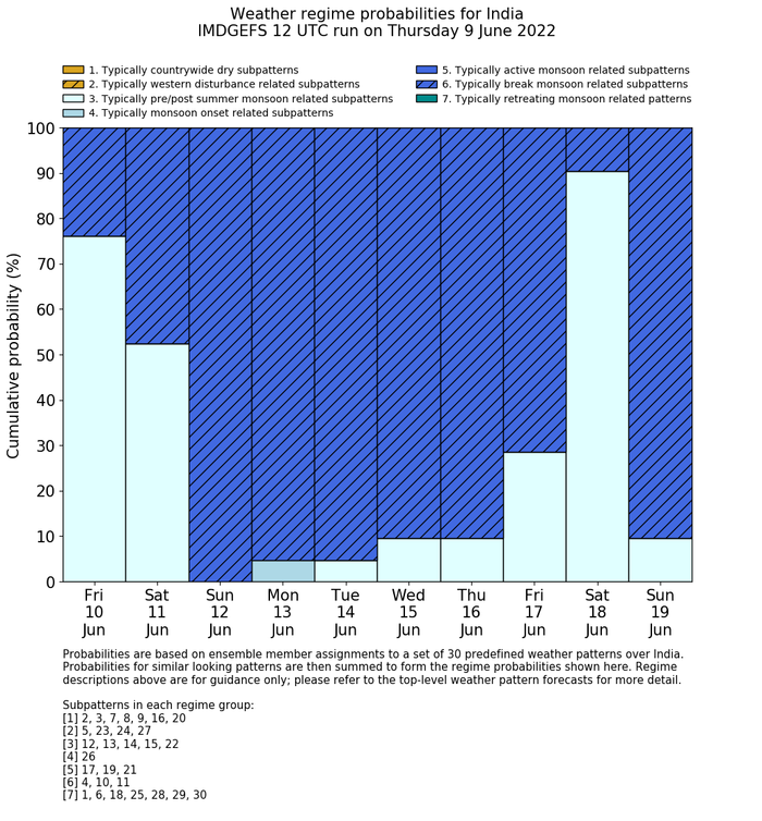 | Weather patterns typically associated with pre-monsoon tendencies over India are most likely Weather patterns 12, 13, 14, 15 and 22 (pre-monsoon) | |