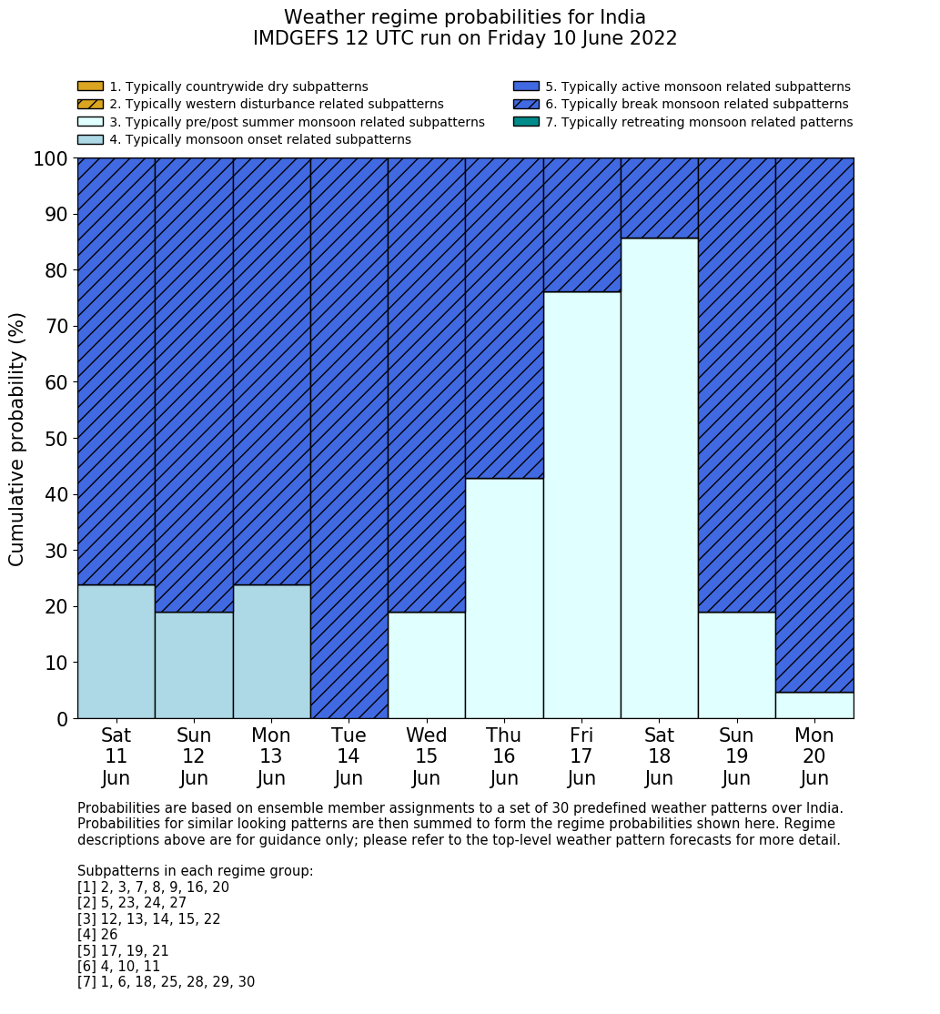 | Weather patterns typically associated with summer monsoon tendencies over India are most likely Weather patterns 12, 13, 15, 15 and 22 (pre/post summer monsoon); 26 (onset); 17, 19 and 21 (active); 4, 10 and 11 (break) | |