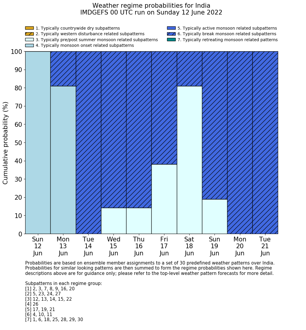 | Weather patterns typically associated with summer monsoon tendencies over India are most likely Weather patterns 12, 13, 15, 15 and 22 (pre/post summer monsoon); 26 (onset); 17, 19 and 21 (active); 4, 10 and 11 (break) | |