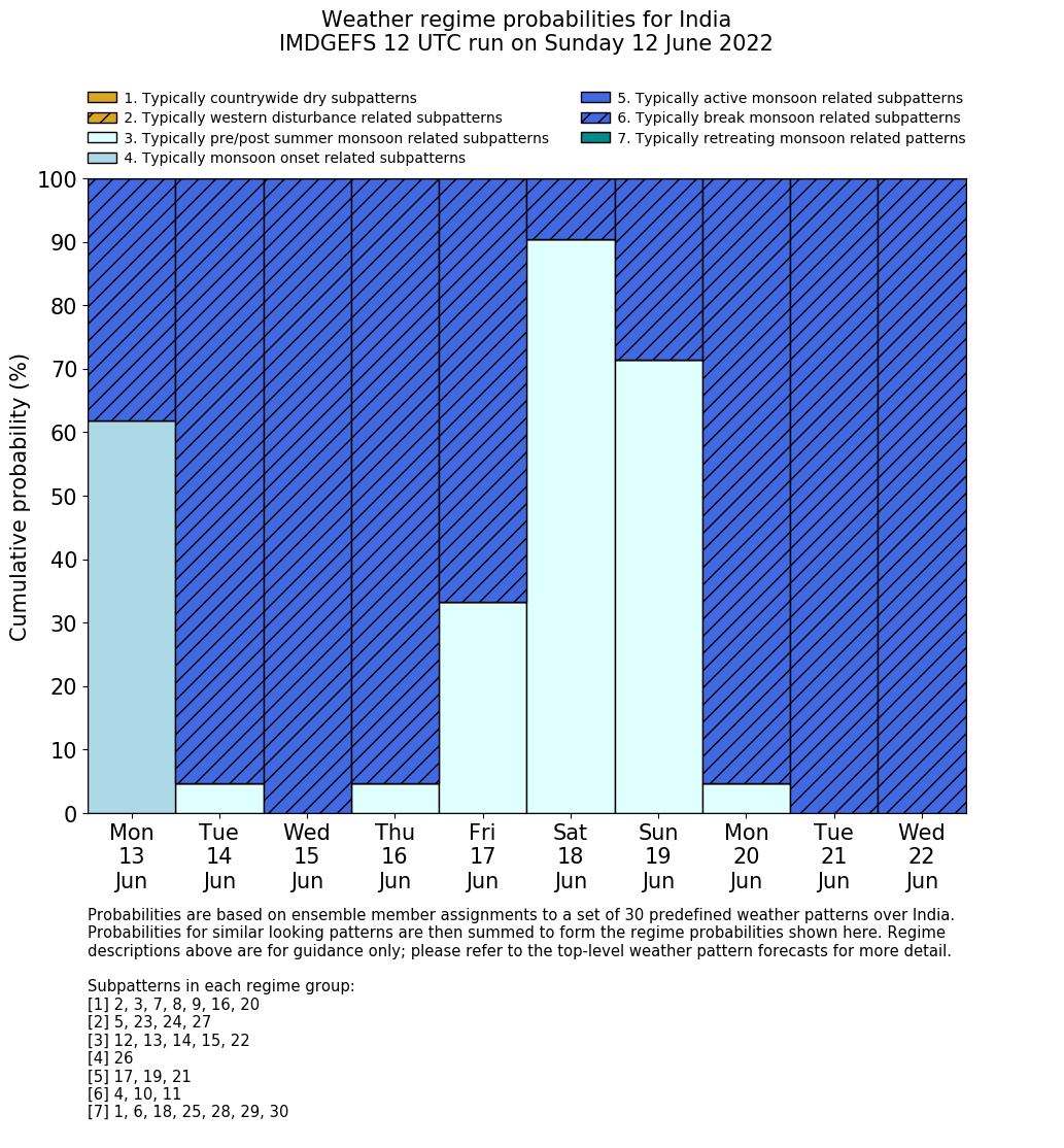 | Weather patterns typically associated with summer monsoon tendencies over India are most likely Weather patterns 12, 13, 15, 15 and 22 (pre/post summer monsoon); 26 (onset); 17, 19 and 21 (active); 4, 10 and 11 (break) | |