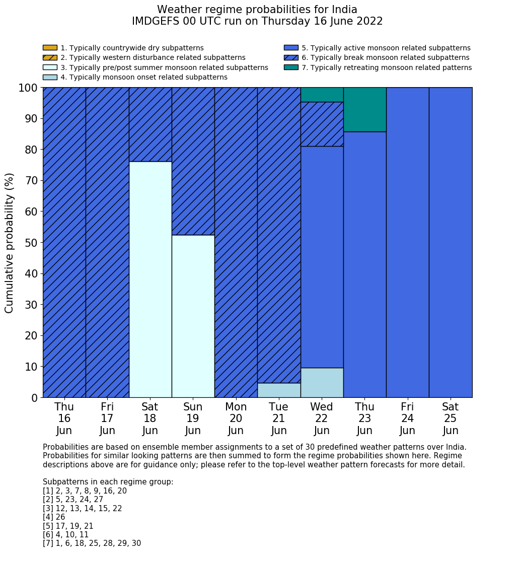 | Weather patterns typically associated with active monsoon tendencies over India are most likely Weather patterns 17, 19 and 21 (active) |