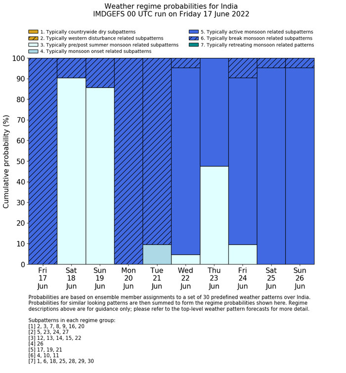 | Weather patterns typically associated with active monsoon tendencies over India are most likely Weather patterns 17, 19 and 21 (active) |