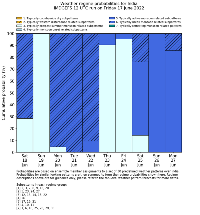 | Weather patterns typically associated with summer monsoon tendencies over India are most likely Weather patterns 12, 13, 15, 15 and 22 (pre/post summer monsoon); 26 (onset); 17, 19 and 21 (active); 4, 10 and 11 (break) | |