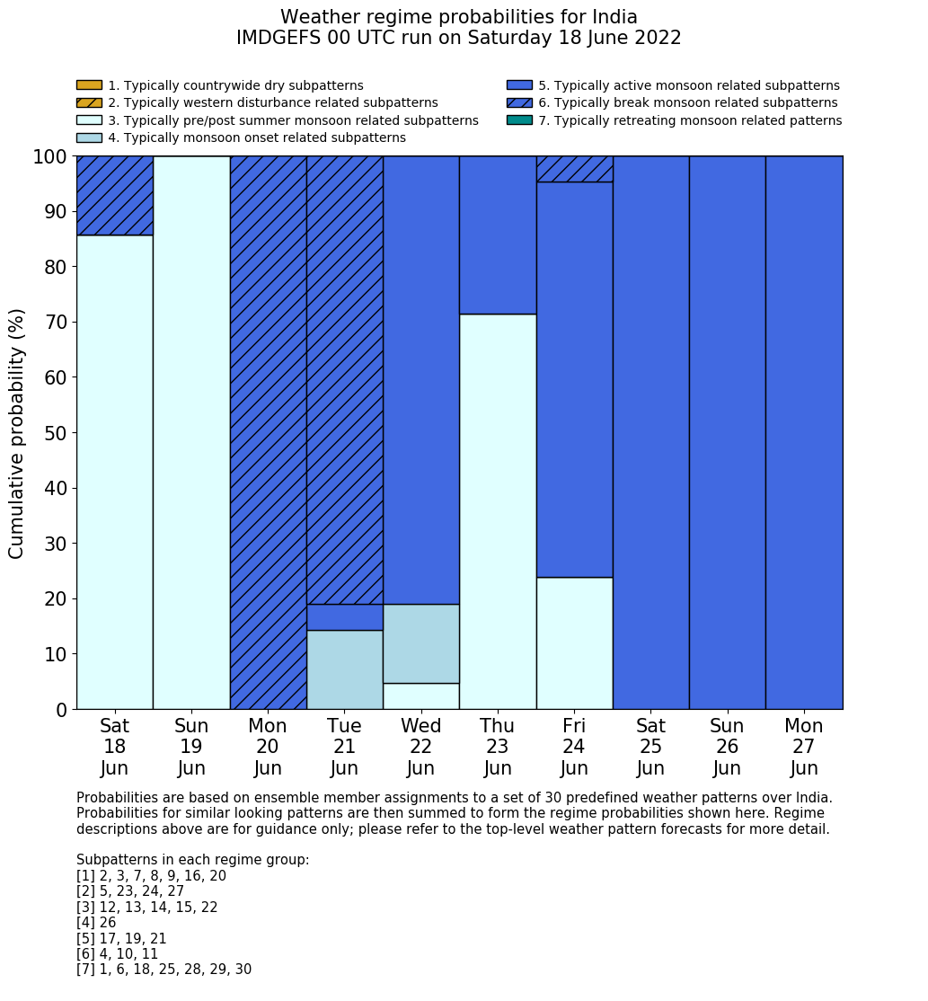 | Weather patterns typically associated with summer monsoon tendencies over India are most likely Weather patterns 12, 13, 15, 15 and 22 (pre/post summer monsoon); 26 (onset); 17, 19 and 21 (active); 4, 10 and 11 (break) | |