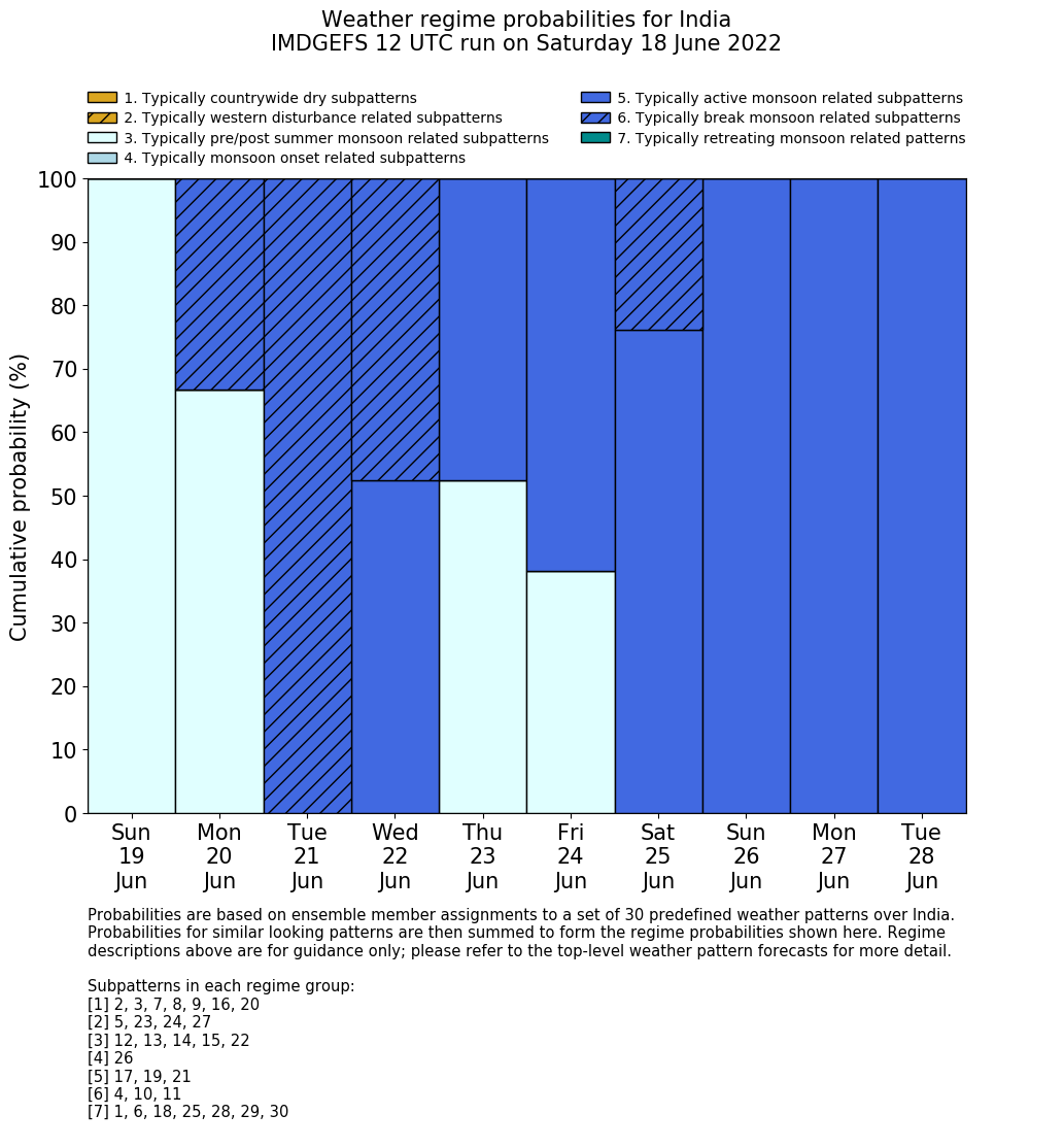 | Weather patterns typically associated with summer monsoon tendencies over India are most likely Weather patterns 12, 13, 15, 15 and 22 (pre/post summer monsoon); 26 (onset); 17, 19 and 21 (active); 4, 10 and 11 (break) | |