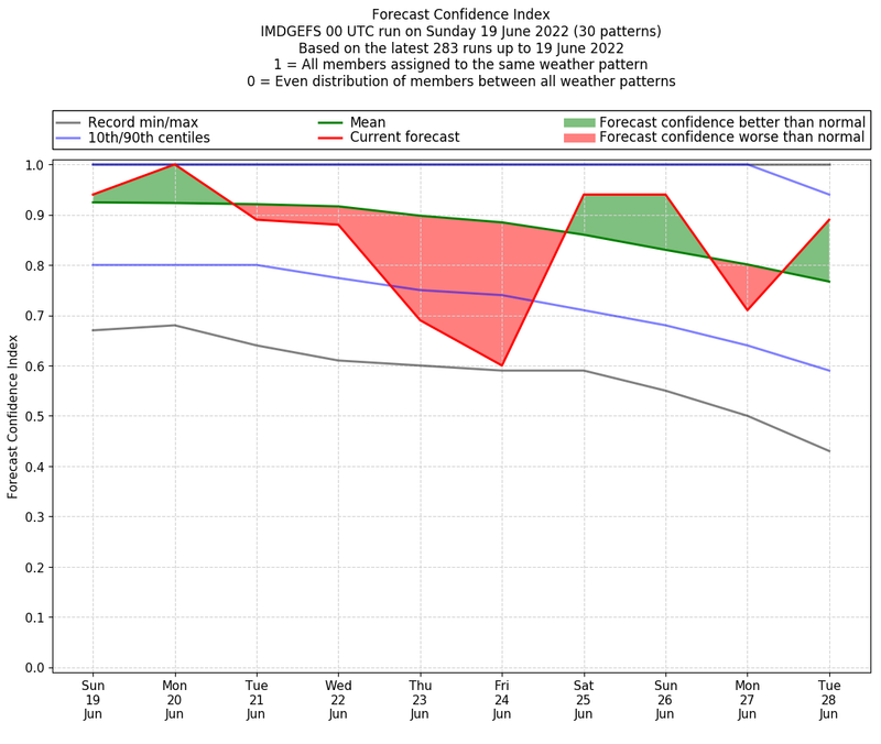 | Weather patterns typically associated with summer monsoon tendencies over India are most likely Weather patterns 12, 13, 15, 15 and 22 (pre/post summer monsoon); 26 (onset); 17, 19 and 21 (active); 4, 10 and 11 (break) | |