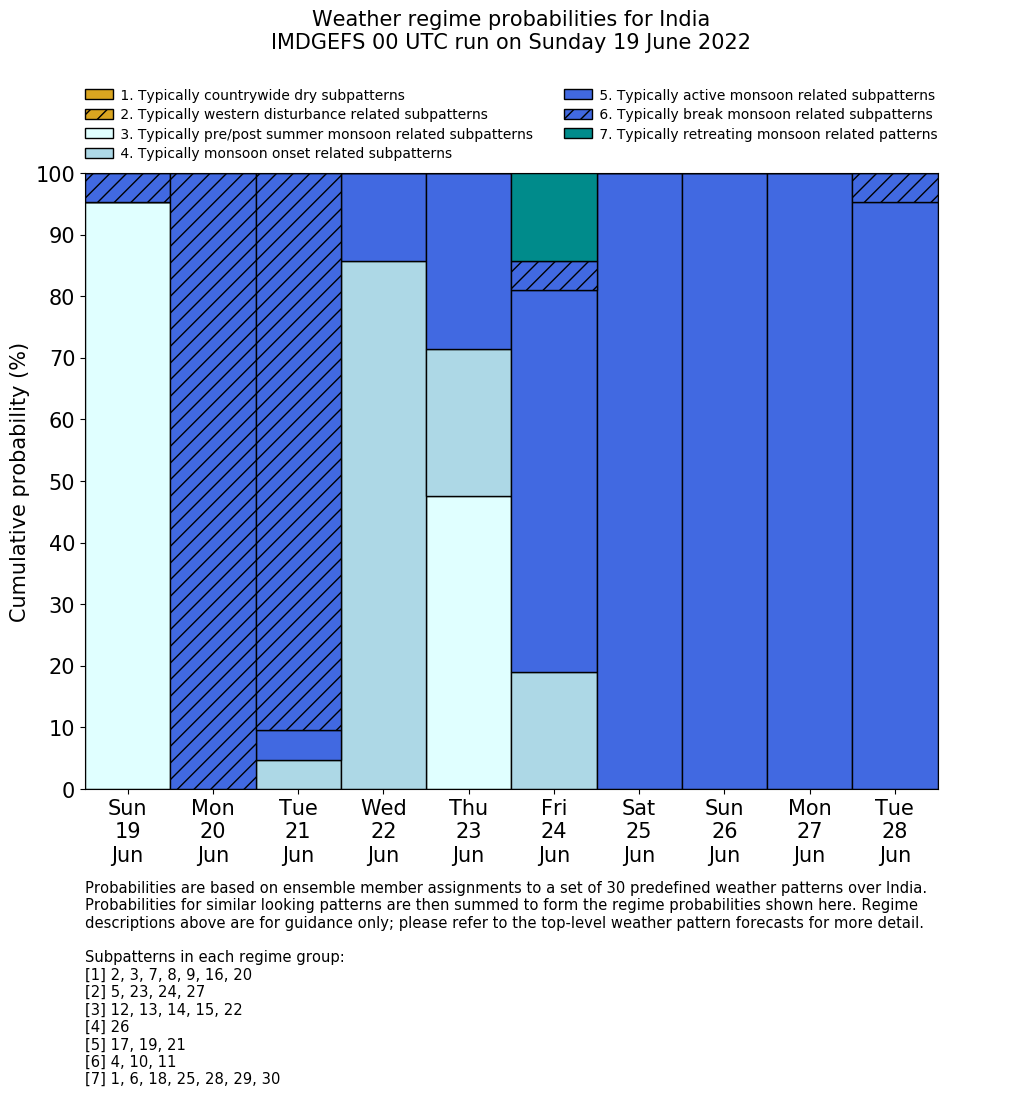 | Weather patterns typically associated with active monsoon tendencies over India are most likely Weather patterns 17, 19 and 21 (active) |