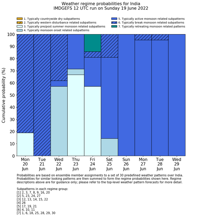 | Weather patterns typically associated with summer monsoon tendencies over India are most likely Weather patterns 12, 13, 15, 15 and 22 (pre/post summer monsoon); 26 (onset); 17, 19 and 21 (active); 4, 10 and 11 (break) | |
