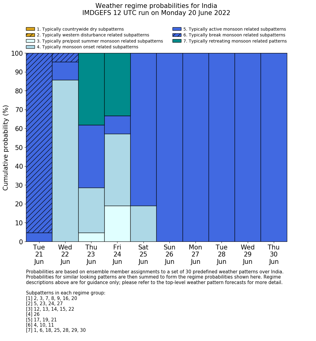 | Weather patterns typically associated with summer monsoon tendencies over India are most likely Weather patterns 12, 13, 15, 15 and 22 (pre/post summer monsoon); 26 (onset); 17, 19 and 21 (active); 4, 10 and 11 (break) | |