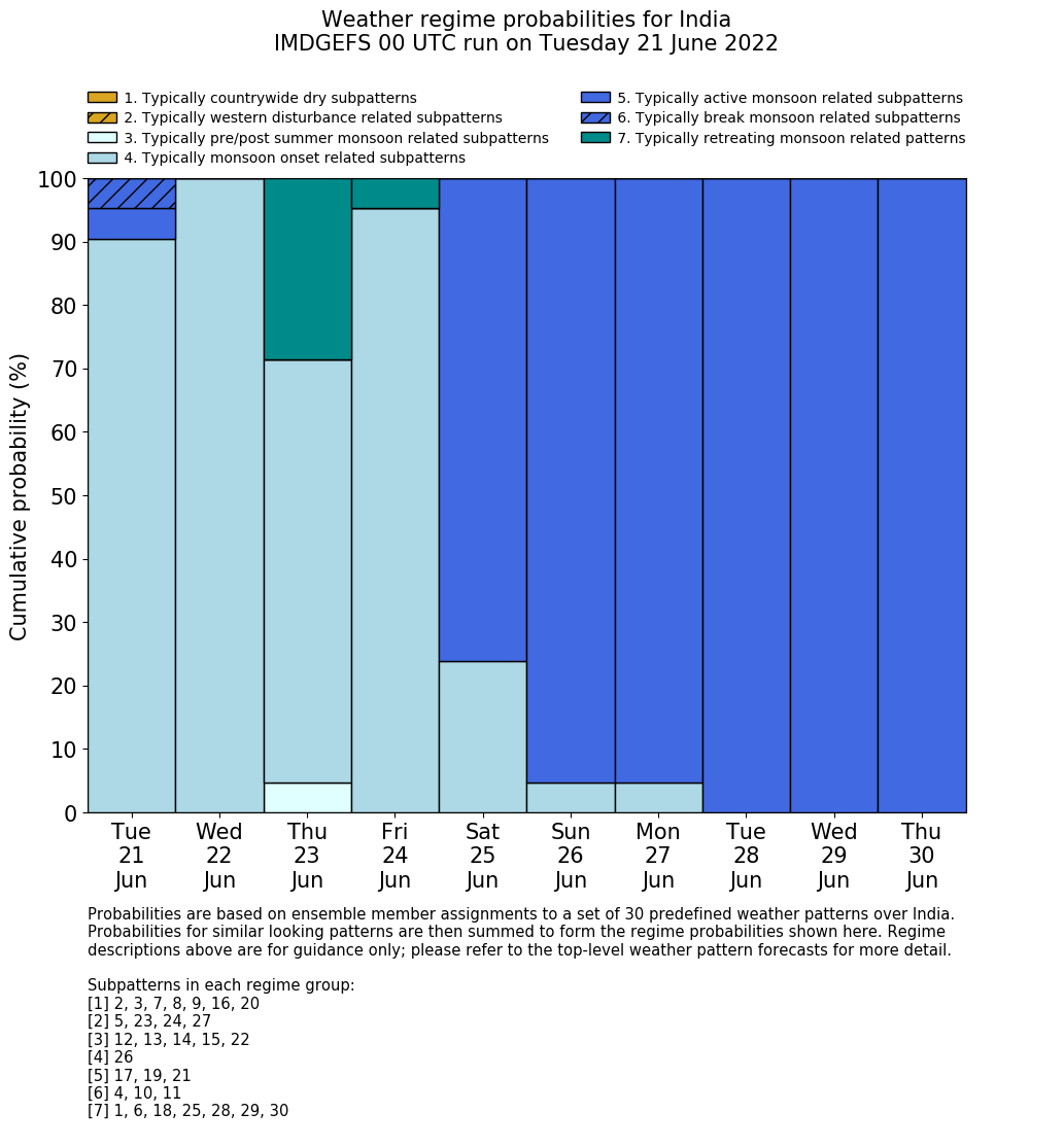 | Weather patterns typically associated with summer monsoon tendencies over India are most likely Weather patterns 12, 13, 15, 15 and 22 (pre/post summer monsoon); 26 (onset); 17, 19 and 21 (active); 4, 10 and 11 (break) | |