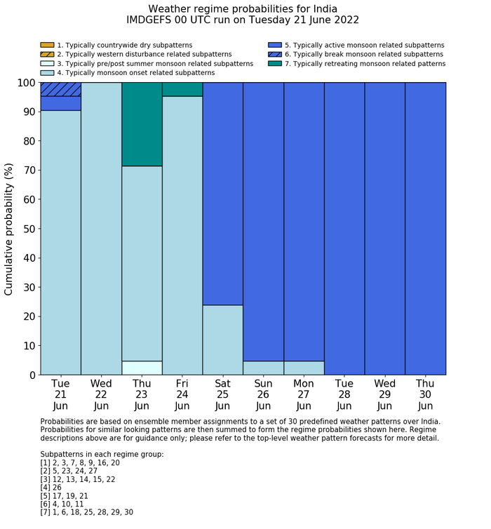 | Weather patterns typically associated with active monsoon tendencies over India are most likely Weather patterns 17, 19 and 21 (active) |