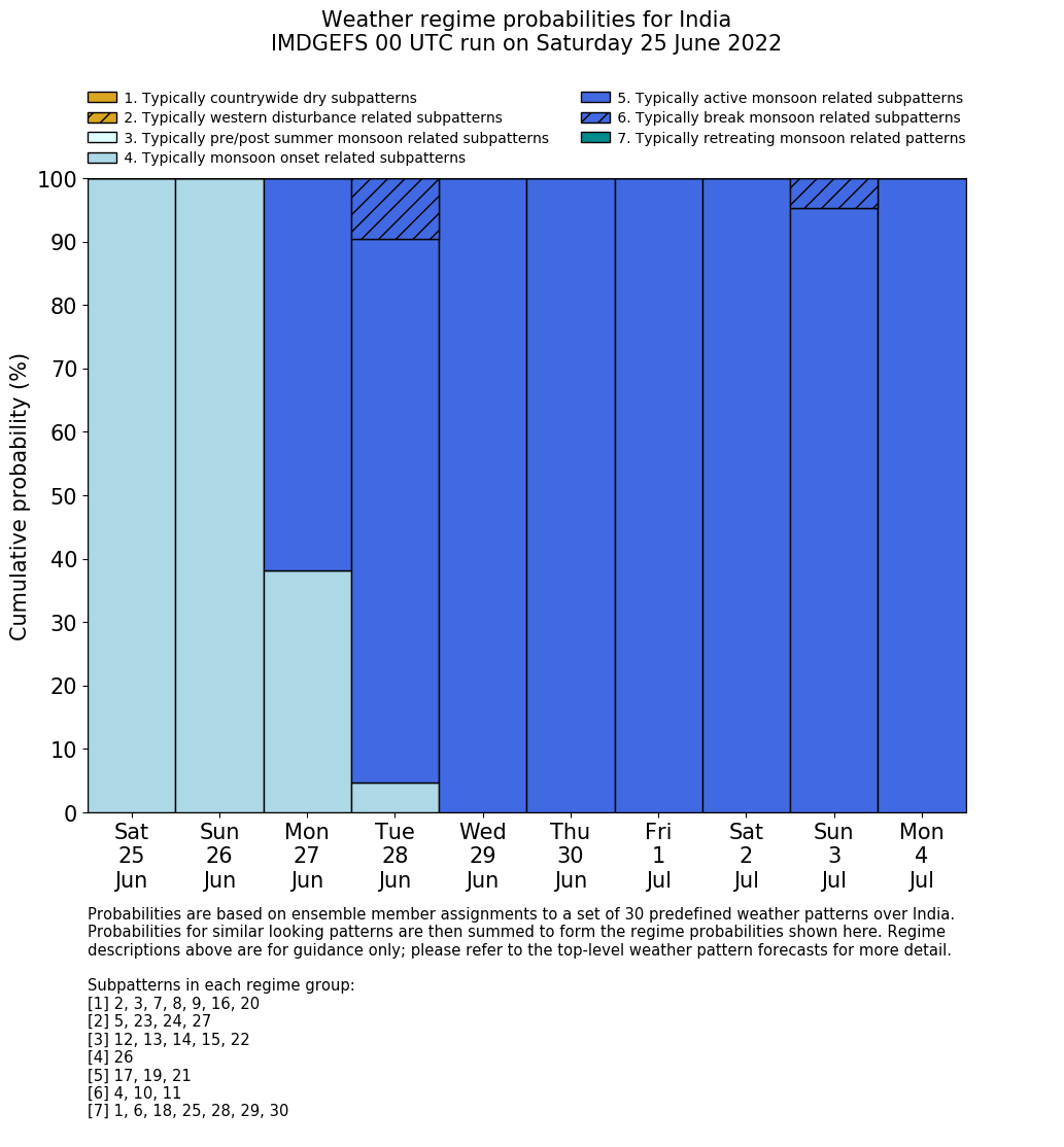 | Weather patterns typically associated with summer monsoon tendencies over India are most likely Weather patterns 12, 13, 15, 15 and 22 (pre/post summer monsoon); 26 (onset); 17, 19 and 21 (active); 4, 10 and 11 (break) | |