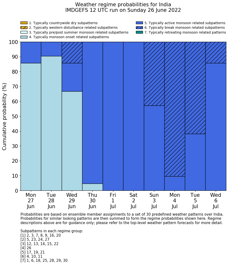 | Weather patterns typically associated with summer monsoon tendencies over India are most likely Weather patterns 12, 13, 15, 15 and 22 (pre/post summer monsoon); 26 (onset); 17, 19 and 21 (active); 4, 10 and 11 (break) | |