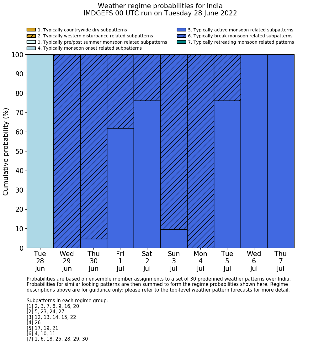 | Weather patterns typically associated with summer monsoon tendencies over India are most likely Weather patterns 12, 13, 15, 15 and 22 (pre/post summer monsoon); 26 (onset); 17, 19 and 21 (active); 4, 10 and 11 (break) | |