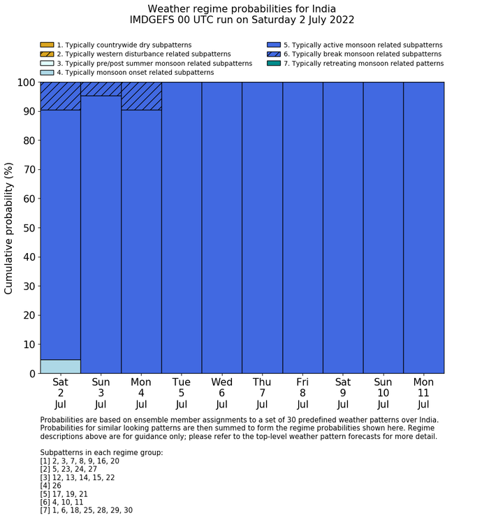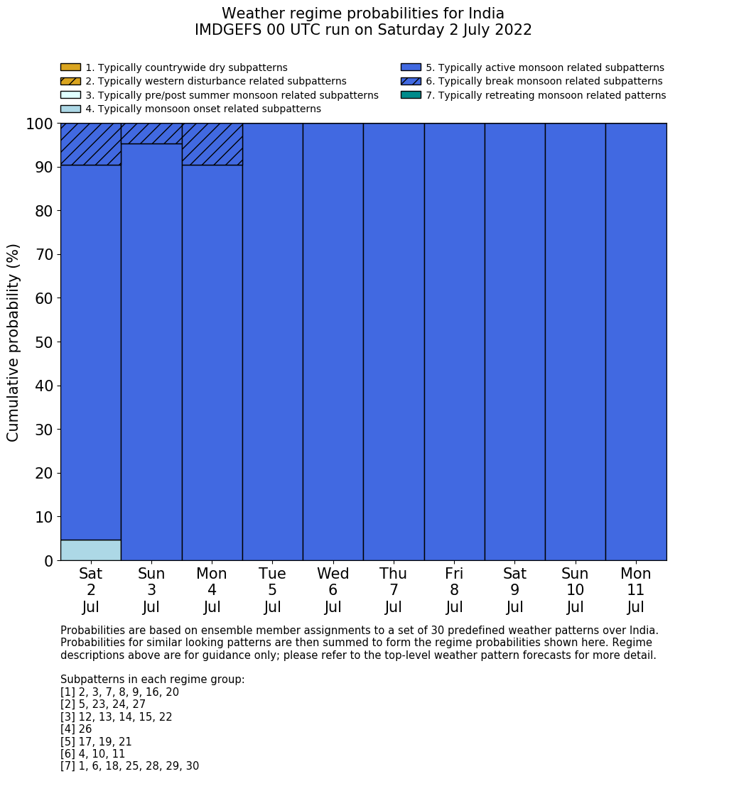 | Weather patterns typically associated with break monsoon tendencies over India are most likely Weather patterns 4, 10 and 11 (break) | |