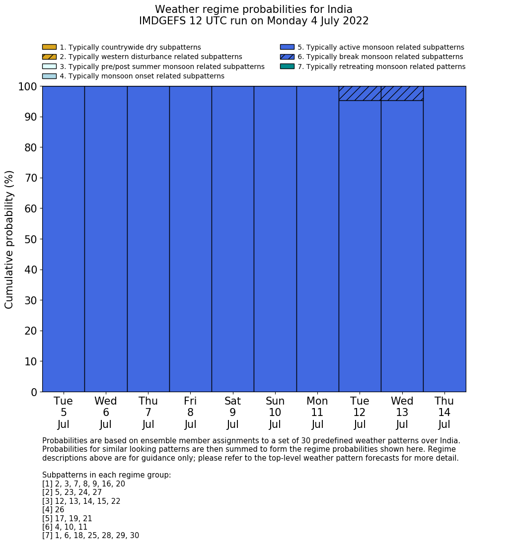 | Weather patterns typically associated with summer monsoon tendencies over India are most likely Weather patterns 12, 13, 15, 15 and 22 (pre/post summer monsoon); 26 (onset); 17, 19 and 21 (active); 4, 10 and 11 (break) | |