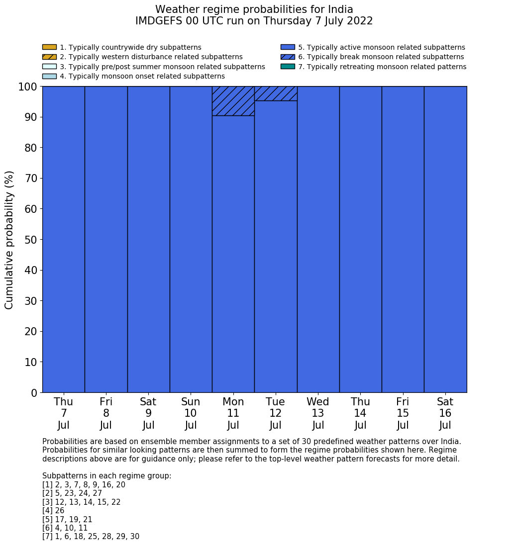 | Weather patterns typically associated with summer monsoon tendencies over India are most likely Weather patterns 12, 13, 15, 15 and 22 (pre/post summer monsoon); 26 (onset); 17, 19 and 21 (active); 4, 10 and 11 (break) | |