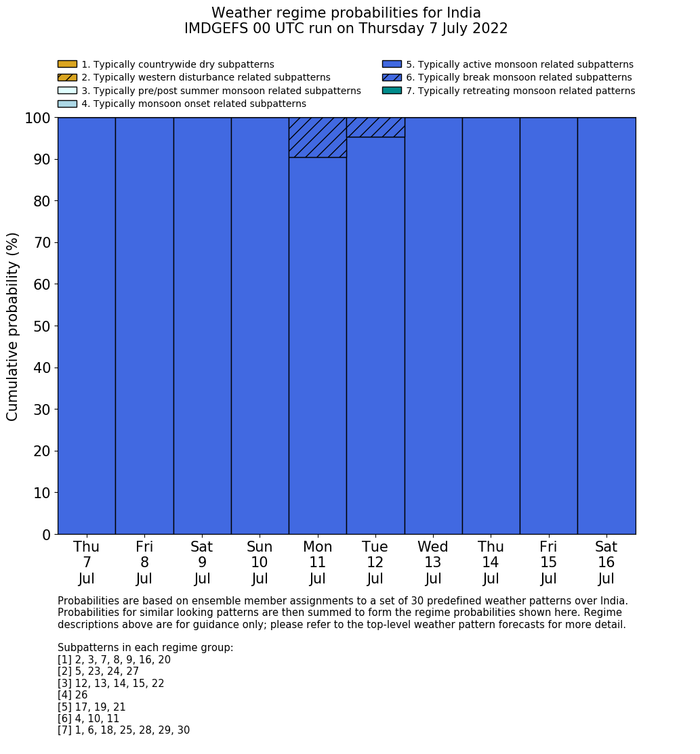 | Weather patterns typically associated with contrywide dry period tendencies over India are most likely Weather patterns 2, 3, 7, 8, 9, 16 and 20 (countrywide winter dry period) | |