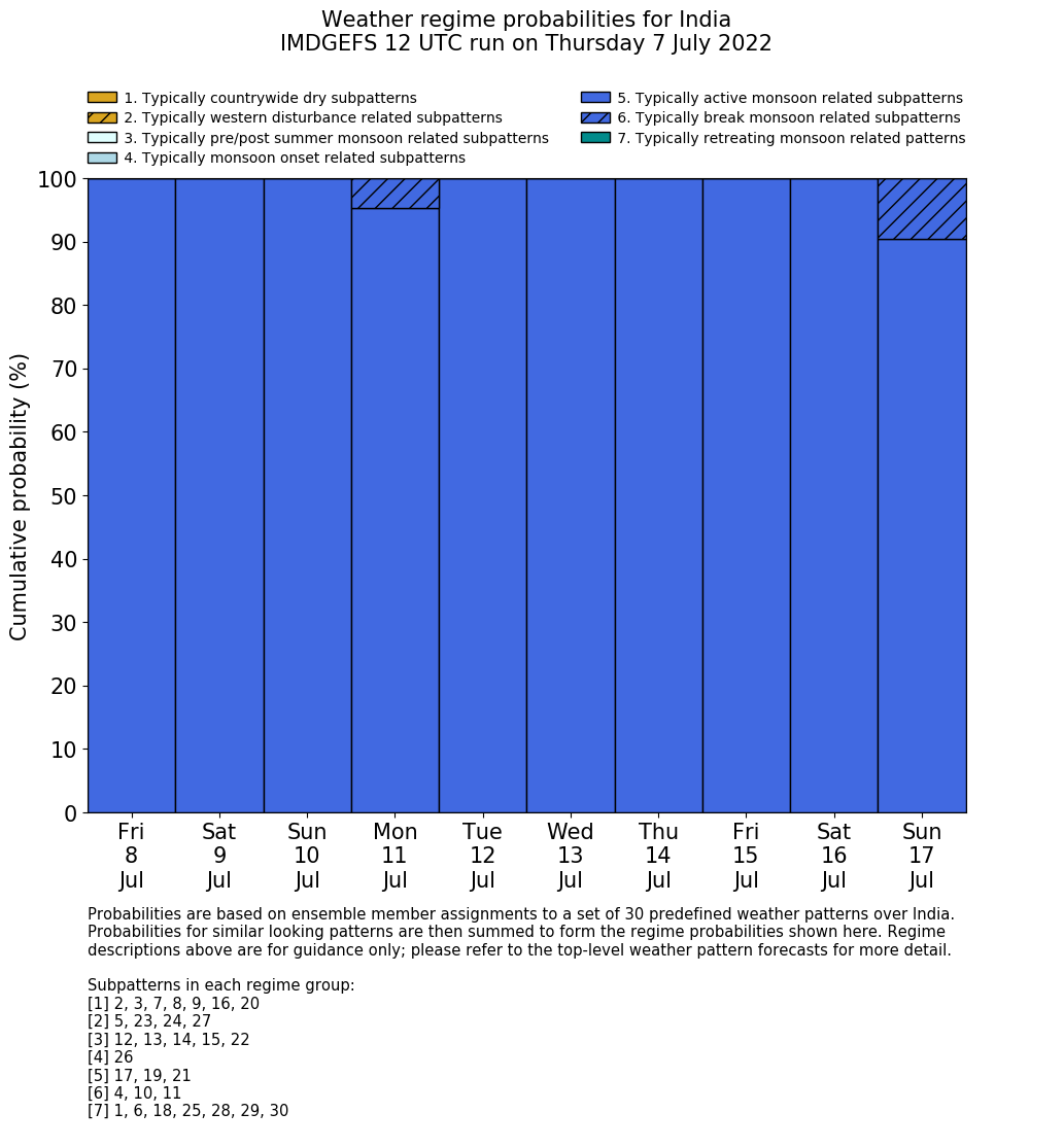 | Weather patterns typically associated with summer monsoon tendencies over India are most likely Weather patterns 12, 13, 15, 15 and 22 (pre/post summer monsoon); 26 (onset); 17, 19 and 21 (active); 4, 10 and 11 (break) | |