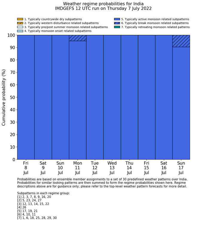| Weather patterns typically associated with contrywide dry period tendencies over India are most likely Weather patterns 2, 3, 7, 8, 9, 16 and 20 (countrywide winter dry period) | |