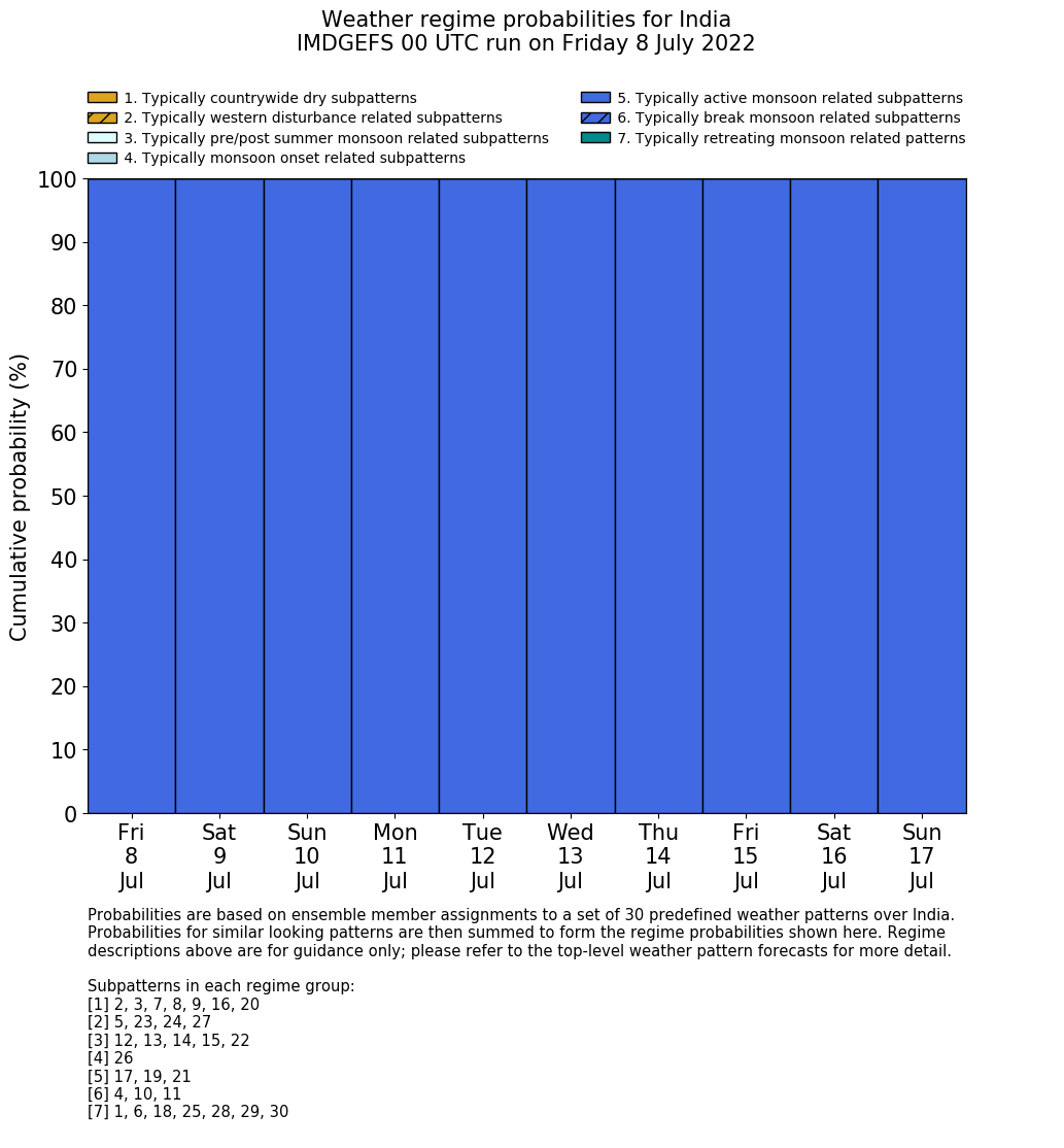 | Weather patterns typically associated with summer monsoon tendencies over India are most likely Weather patterns 12, 13, 15, 15 and 22 (pre/post summer monsoon); 26 (onset); 17, 19 and 21 (active); 4, 10 and 11 (break) | |
